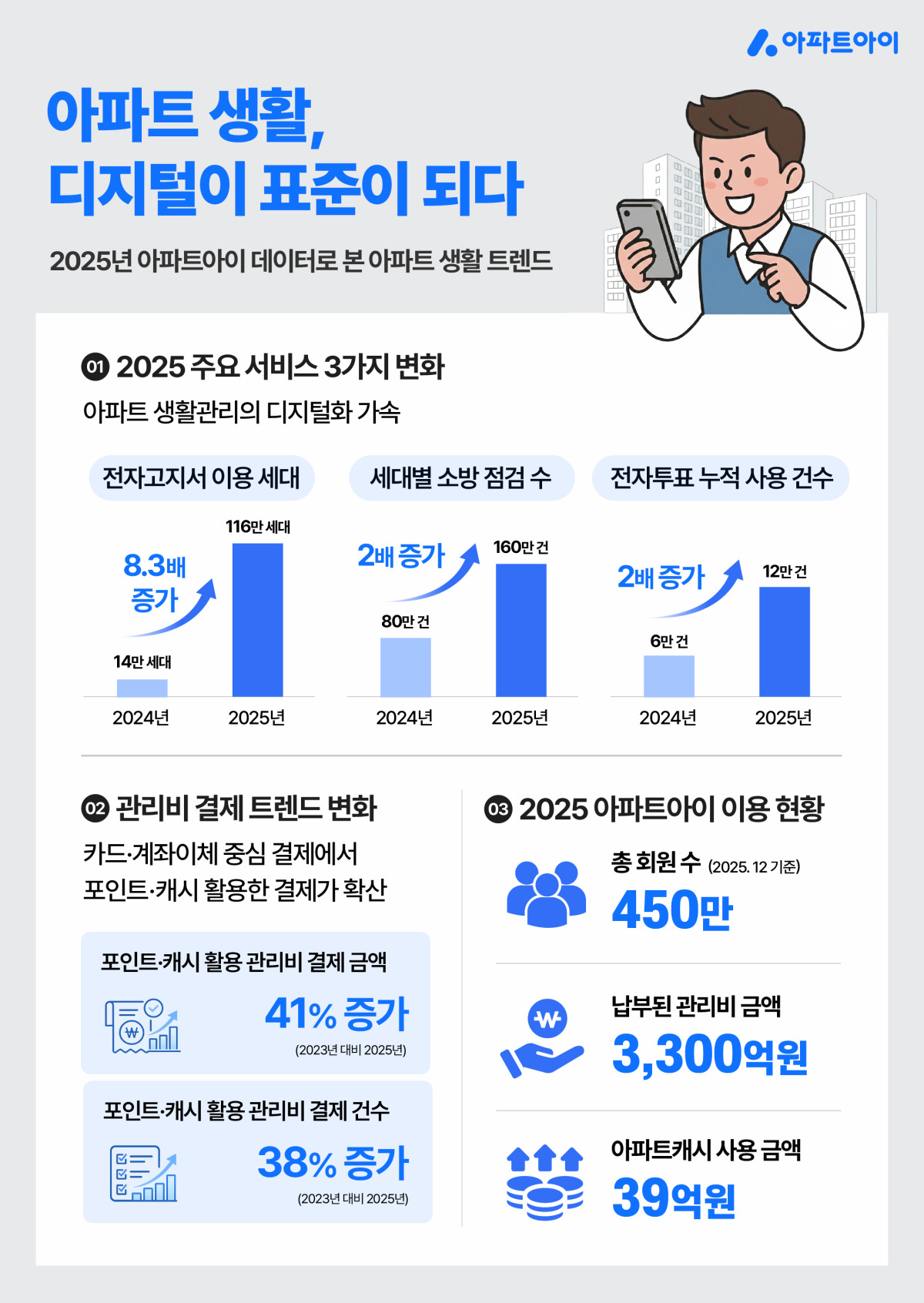 관리비를 한 푼이라도 아끼려는 알뜰 소비 열풍도 아파트 주거 문화에 스며들었다. 과거 신용카드나 계좌이체에만 의존하던 결제 방식에서 벗어나, 흩어진 포인트와 캐시를 끌어모아 관리비를 납부하는 입주민이 눈에 띄게 늘었다. 포인트를 적극적으로 활용한 관리비 결제 건수는 2024년 120만건에서 2025년 170만건으로 약 40% 상승했다. 같은 기간 관련 결제 금액 규모 역시 2500억원에서 3500억원으로 40% 넘게 불어났다.