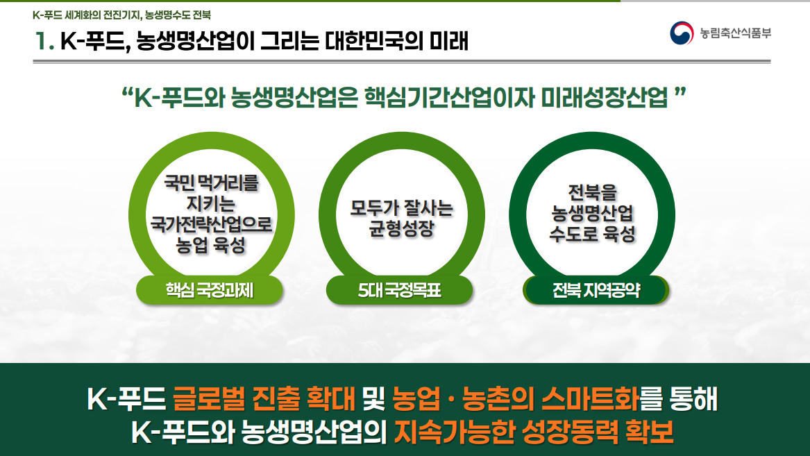K-푸드 글로벌 진출 확대와 농업·농촌의 스마트화를 통해 지속 가능한 성장동력을 확보하겠다는 구상이다.
