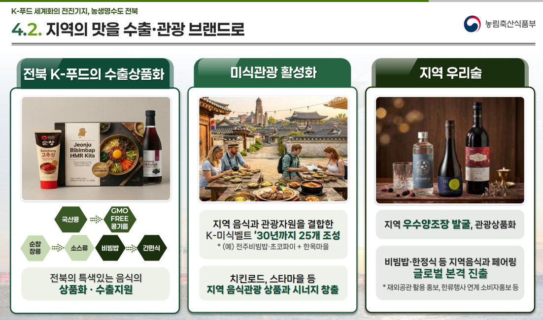 지역 우수 양조장을 발굴해 관광상품화하고, 비빔밥·한정식 등 지역 음식의 글로벌 진출도 본격화한다.