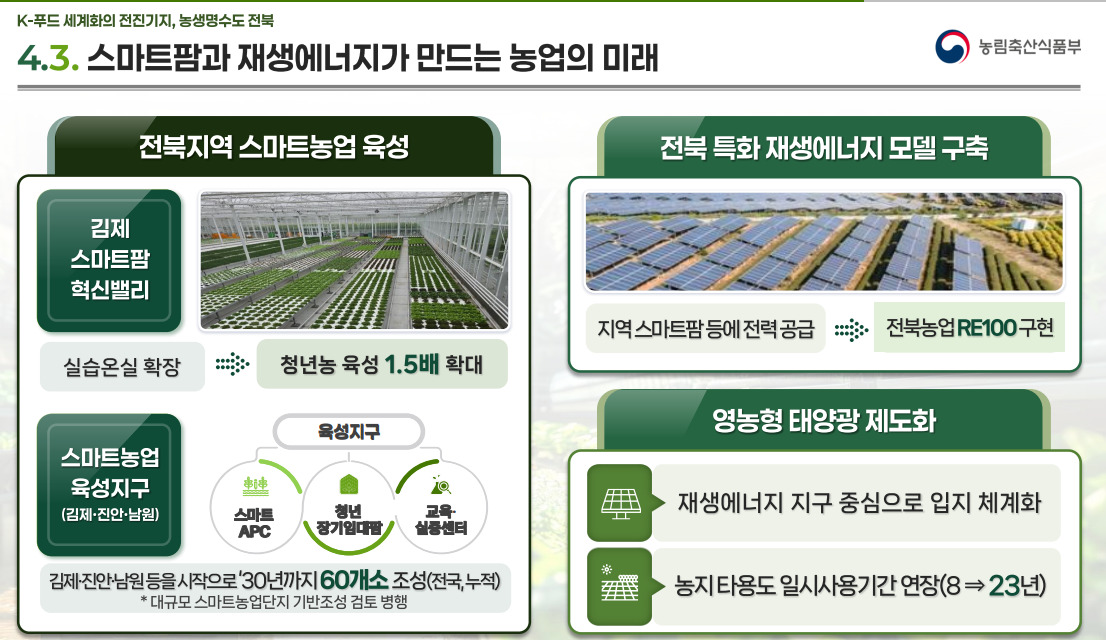 김제·진안·남원 등을 중심으로 스마트농업 육성지구를 조성해 2030년까지 60개소를 만들겠다는 목표를 세웠다. 스마트 APC, 교육·실증센터, 청년 장기임대팜 등을 연계한 집적화 모델도 구축한다.