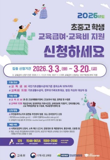 [서울=뉴스핌] 송주원 기자 = 교육부는 2026학년도 초·중·고 학생을 대상으로 저소득층 가구의 교육격차를 줄이고 교육비 부담을 덜기 위한 교육급여·교육비 지원 집중 신청 기간을 오는 3일부터 20일까지 운영한다고 2일 밝혔다.