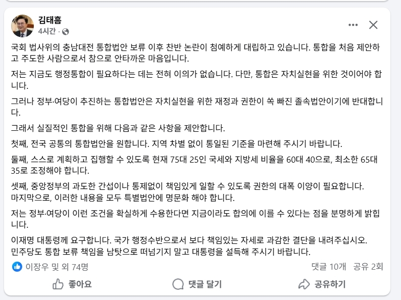 그는 "행정통합의 필요성에는 전혀 이의가 없다"면서도 "통합은 자치 실현을 위한 것이어야 한다"고 강조했다. 이어 정부·여당이 추진 중인 법안에 대해 "자치 실현을 위한 재정과 권한이 빠진 졸속 법안"이라고 지적하며 반대 입장을 분명히 했다.