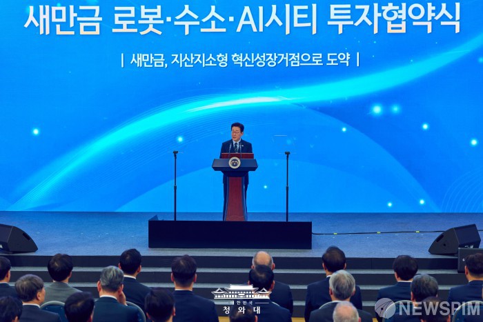 [서울=뉴스핌] 이재명 대통령이 27일 전북 군산 새만금컨벤션센터에서 열린 새만금 로봇·수소·AI 시티 투자 협약식에서 발언을 하고 있다. [사진=청와대] 2026.02.27 photo@newspim.com