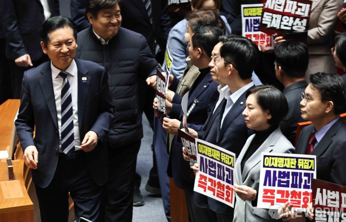 [서울=뉴스핌] 윤창빈 기자 = 국민의힘 의원들이 27일 오후 서울 여의도 국회에서 열린 본회의에서 헌법재판소법 일부개정법률안(대안)에 대한 무제한 종결동의의 건이 상정되자 피켓팅을 하고 있는 가운데 정청래 더불어민주당 대표가 앞을 지나가고 있다. 2026.02.27 pangbin@newspim.com