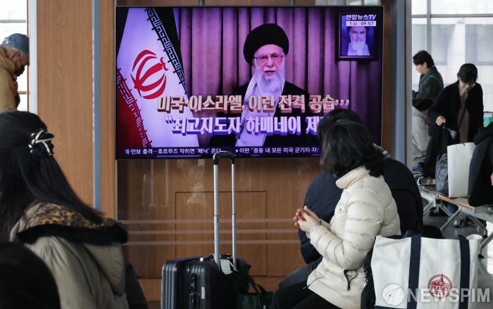 [서울=뉴스핌] 양윤모 기자 = 1일 오전 서울 용산구 서울역 대합실을 찾은 시민들이 美·이스라엘의 對이란 공격으로 인한 하메네이 사망방송을 시청하고 있다.2026.03.01 yym58@newspim.com
