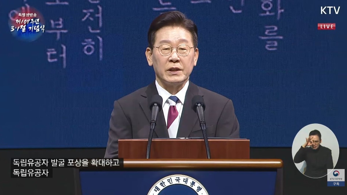 이재명 대통령이 1일 서울 코엑스 오디토리움에서 열린 제107주년 3·1절 기념식에 참석해 기념사를 하고 있다. [사진=KTV]