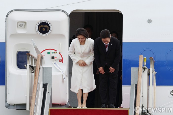 [성남=뉴스핌] 이형석 기자 = 이재명 대통령과 배우자 김혜경 여사가 1일 성남공항에서 싱가포르-필리핀 정상회담 참석을 위해 출국하고 있다. 2026.03.01 leehs@newspim.com