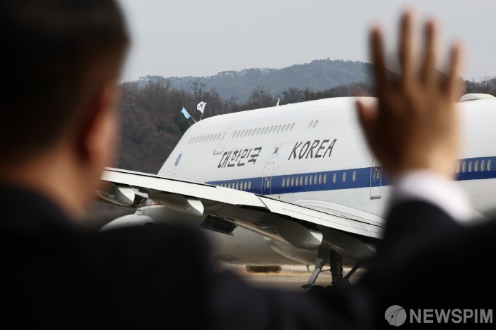 [성남=뉴스핌] 이형석 기자 = 이재명 대통령이 탑승한 공군1호기가 1일 성남공항에서 싱가포르 - 필리핀 정상회담을 위해 이륙하고 있다. 2026.03.01 leehs@newspim.com