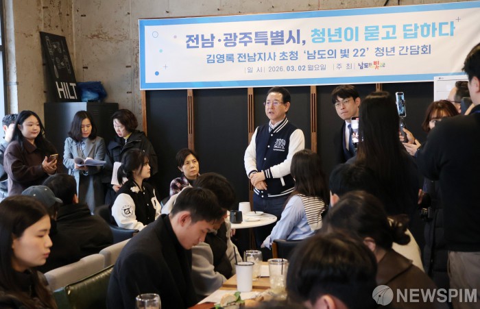 [광주=뉴스핌] 박진형 기자 = 김영록 전남도지사가 2일 광주 광산구 한 베이커리 카페에서 지역 청년 30여명을 초청해 광주·전남 행정통합 간담회를 갖고 있다. 2026.03.02 bless4ya@newspim.com