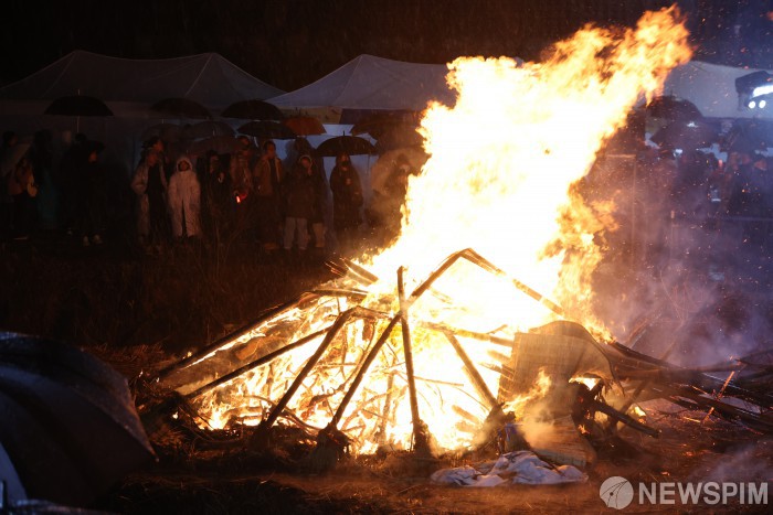 [서울=뉴스핌] 이형석 기자 = 2일 밤 서울 노원구 당현천 일대에서 열린 정월대보름 행사에서 액운 소멸과 풍년을 기원하는 달집이 타오르고 있다. 2026.03.02 leehs@newspim.com