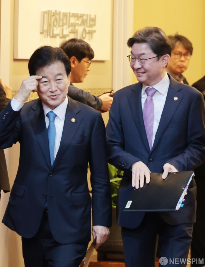 [서울=뉴스핌] 이길동 기자 = 정동영 통일부 장관(왼쪽)과 이억원 금융위원장이 3일 오전 서울 종로구 정부서울청사에서 열린 국무회의에 참석하고 있다.2026.03.03 gdlee@newspim.com
