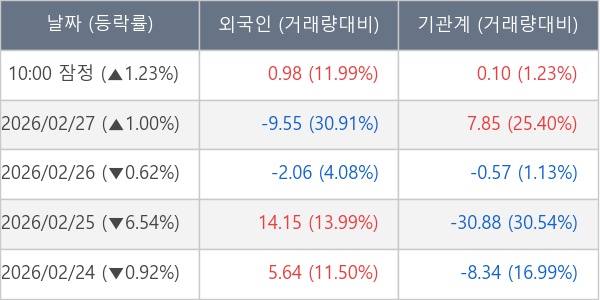 [서울=뉴스핌] 로보뉴스 = 03일 10시 15분 현재 한솔아이원스(114810)는 외국인과 기관이 각각 0.98 만 주, 0.10 만 주 순매수(잠정) 하면서 전일 대비 1.23% (현재가 16,410원) 상승하고 있다.