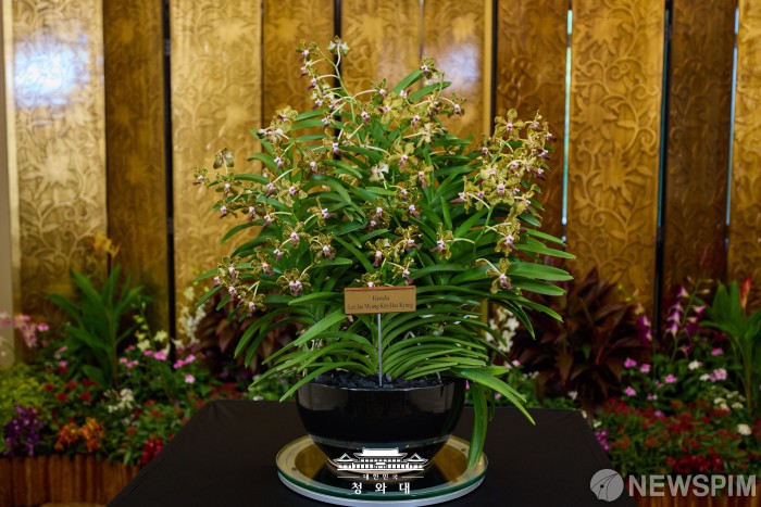 [서울=뉴스핌] 이재명 대통령과 김혜경 여사가 지난 2일 싱가포르에서 열린 국빈방문 공식환영식 후 타르만 샨무가라트남 대통령, 부인 제인 이토기 샨무가라트남 여사와 난초 명명식에 참석했다. 사진의 난초는 이재명 대통령과 김혜경 여사의 이름이 붙여진 난초. [사진=청와대] 2026.03.03 photo@newspim.com