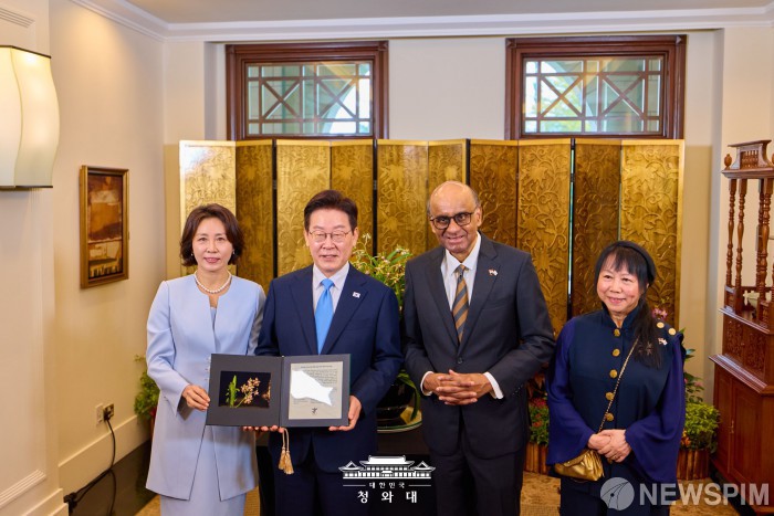 [서울=뉴스핌] 이재명 대통령과 김혜경 여사가 지난 2일 싱가포르에서 열린 국빈방문 공식환영식 후 타르만 샨무가라트남 대통령, 부인 제인 이토기 샨무가라트남 여사에게 난초를 선물받고 긴념촬영을 하고 있다. [사진=청와대] 2026.03.03 photo@newspim.com