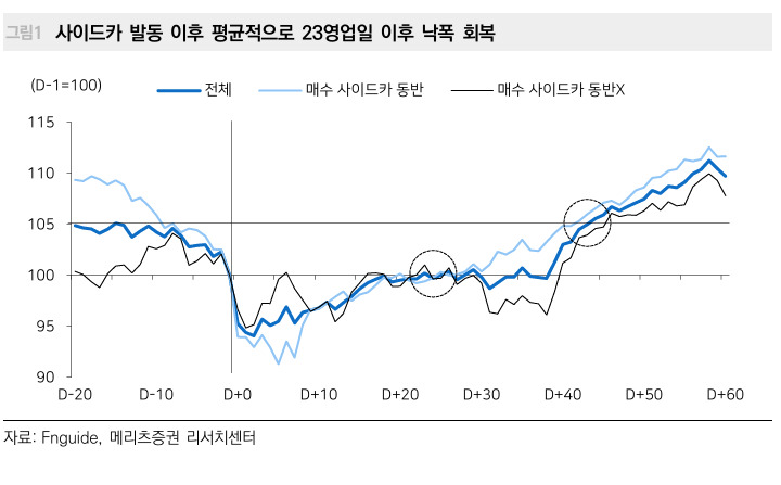 이 연구원은 "사이드카 발동 이후 지수가 당일 낙폭을 모두 회복하는 데 걸린 시간은 평균 23영업일이었다"며 "44영업일에는 지수가 평균 5% 반등하며 시장의 위험회피 성향이 본격적으로 둔화되는 흐름을 보였다"고 설명했다.