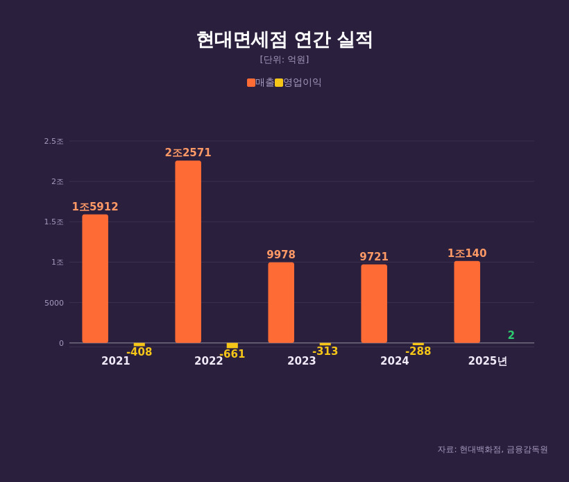 지난해를 기점으로 실적 측면에서도 체질 개선이 가시화되고 있다. 현대면세점은 2021년 매출 1조5912억원에서 2022년 2조2571억원으로 41.9% 급증하며 정점을 찍었다. 그러다 2023년에는 9978억원으로 전년 대비 55.8% 급감했고 2024년에도 9721억원으로 2.6%  줄었다. 이 기간 영업이익은 ▲2021년 마이너스(-) 408억원 ▲2022년 -661억원 ▲2023년 -313억원 ▲2024년 -288억원으로 4년 연속 적자를 이어갔다.