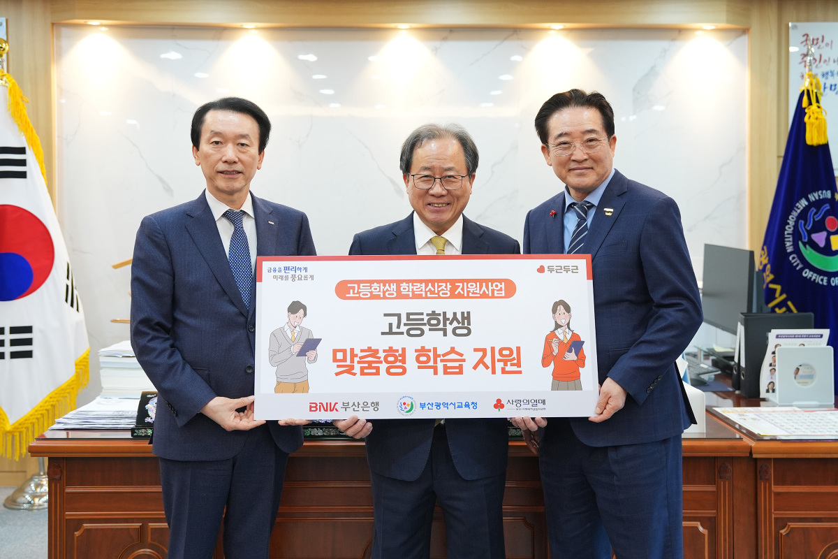[서울=뉴스핌] 채송무 기자 = BNK부산은행(은행장 김성주)은 4일(수) 오전, 부산광역시교육청에서 부산시교육청, 부산사회복지공동모금회와 함께 '고등학생 학력신장 지원사업' 지원식을 개최했다.(사진 왼쪽부터 BNK부산은행 김성주 은행장, 부산광역시교육청 김석준 교육감, 부산사회복지공동모금회 이수태 회장)[사진=BNK부산은행]2026.03.04 dedanhi@newspim.com