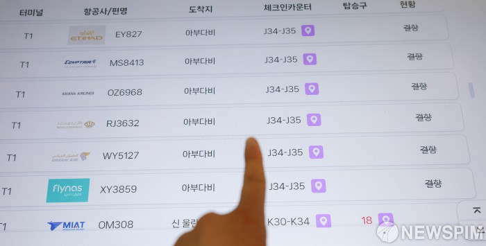 [영종도=뉴스핌] 류기찬 기자 = 미국의 이란 공습으로 중동 지역의 군사적 긴장이 고조되고 있는 가운데 4일 오후 인천국제공항 제1여객터미널 안내 모니터에 이날 결항된 아부다비행 항공편이 표시되고 있다. 2026.03.04 ryuchan0925@newspim.com