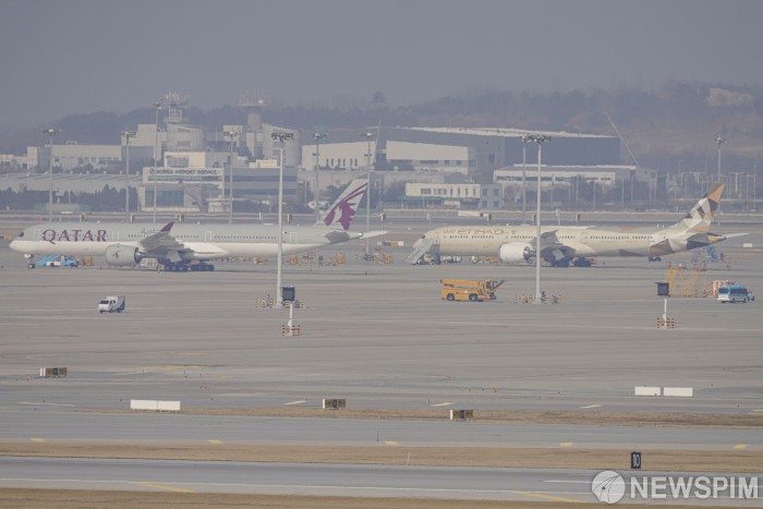[영종도=뉴스핌] 류기찬 기자 = 미국의 이란 공습으로 중동 지역의 군사적 긴장이 고조되고 있는 가운데 4일 오후 인천국제공항 주기장에 이날 결항된 도하행 카타르항공 A350-1041(왼쪽부터), 아부다비행 에티하드 항공 B787-10이 주기되어 있다. 2026.03.04 ryuchan0925@newspim.com