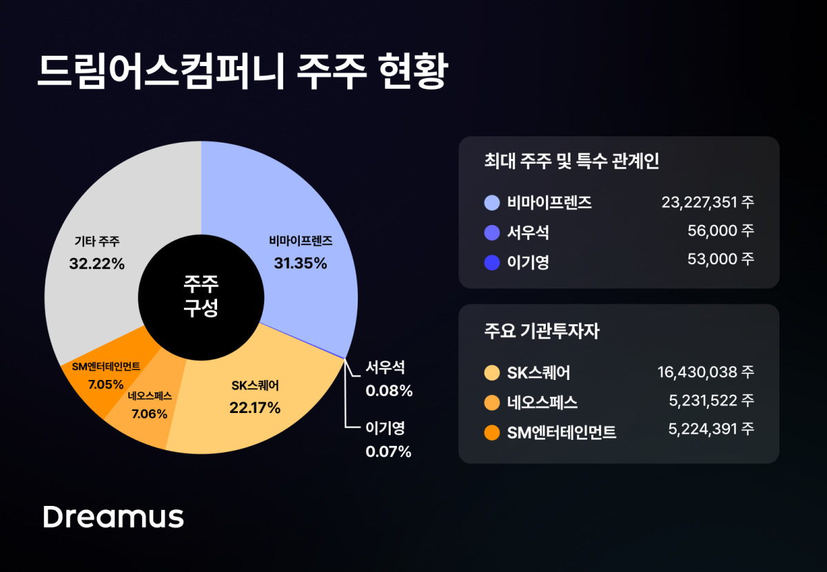 드림어스컴퍼니 기타비상무이사인 서우석 이사는 5만6000주를 보유하고 있다. 두 경영진의 보유 주식은 합산 10만9000주다.