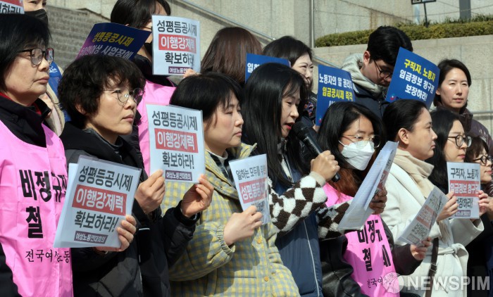 [서울=뉴스핌] 이길동 기자 = 여성 노동 연대회의 관계자들이 5일 오전 서울 종로구 세종문화회관 계단 앞에서 제118주년 3·8 세계 여성의 날 기념 '임금이 드러나는 순간, 평등이 시작된다' 성평등 공시제 도입 요구 기자회견을 하고 있다. 2026.03.05 gdlee@newspim.com