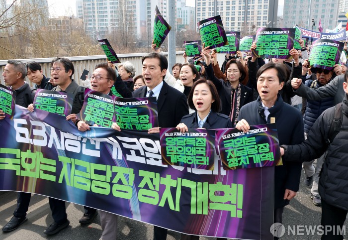 [서울=뉴스핌] 이건주 인턴기자 = 조국 조국혁신당 대표 등 야당 관계자들이 5일 오전 서울 영등포역 앞에서 열린 '2026 지방선거 정치개혁 촉구 시민대행진'에 참석하고 있다. 참가자들은 기자회견 후 국회 본청까지 행진하며 선거제도 개혁 입법을 촉구했다. 2026.03.05 kunjoo@newspim.com
