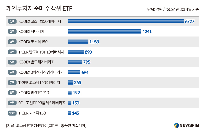 개인 순매수 1위는 KODEX 코스닥150레버리지로 하루 동안 6727억원이 몰렸다. 이어 KODEX 레버리지(4241억원), KODEX 코스닥150(1158억원) 등이 뒤를 이었다. 이 밖에도 TIGER 반도체TOP10레버리지(890억원), KODEX 반도체레버리지(795억원), KODEX 2차전지산업레버리지(694억원) 등 주요 업종 레버리지 상품으로 자금이 집중됐다.