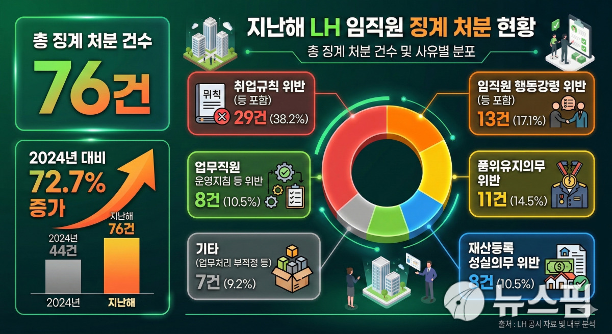 [서울=뉴스핌] 정영희 기자 = 과거 투기 사태 이후 강도 높은 쇄신을 약속했던 한국토지주택공사(LH) 내부에서 여전히 비위 문제가 이어지고 있는 것으로 나타났다. 지난해 내부 징계 건수가 증가한 데 이어 금품 수수 등 중대 비위 사례도 끊이지 않으면서 조직 기강 해이에 대한 우려가 커지고 있다.