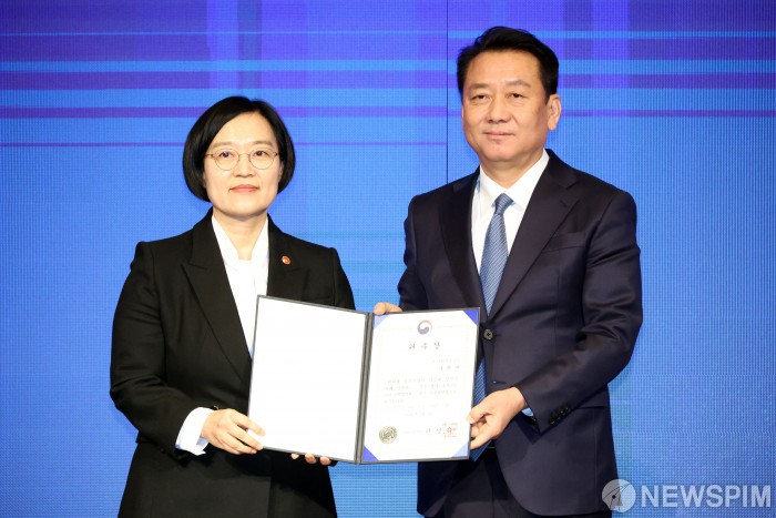 [서울=뉴스핌] 이건주 인턴기자 = 한성숙 중소벤처기업부 장관(왼쪽)이 5일 오후 서울 여의도 중소기업중앙회에서 열린 '중소·벤처·소상공인 민관 정책협의회 출범식'에서 이광재 민간 공동위원장에게 위촉장 수여 후 기념촬영을 하고 있다. 2026.03.05 kunjoo@newspim.com