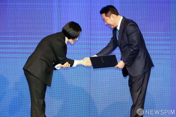 [서울=뉴스핌] 이건주 인턴기자 = 한성숙 중소벤처기업부 장관(왼쪽)이 5일 오후 서울 여의도 중소기업중앙회에서 열린 '중소·벤처·소상공인 민관 정책협의회 출범식'에서 민간 공동위원장인 이광재 전 국회 사무총장에게 위촉장을 수여한 뒤 악수하고 있다. 2026.03.05 kunjoo@newspim.com