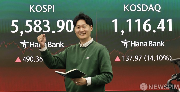 코스피 9.6%·코스닥 14% 상승 [서울=뉴스핌] 윤채영 기자 = 코스피·코스닥 지수가 5일 역대급 상승률을 기록하며 마감했다. 코스피는 2008년 이후 최고 상승률을, 코스닥은 역대 최고 상승률을 기록했다. 한국거래소에 따르면 이날 코스피 지수는 전 거래일 대비 490.36포인트(9.63%) 오른 5583.90에 마감했다. 개인은 1조7919억원 순매수했고, 외국인과 기관은 각각 1445억원, 1조7141억원 순매도했다. [서울=뉴스핌] 양윤모 기자= 뉴욕증시가 美·이란 접촉설에 반등한 가운데 5일 오전 코스피가 전장 종가보다 579.64 포인트(11.38%) 상승하며 5673.18로, 코스닥은 101.55포인트(10.38%) 상승한 1079.99로 거래를 시작한 가운데, 서울 중구 하나은행 을지로본점 딜링룸에서 직원들이 업무를 보고 있다. 서울외환시장에서 달러/원 환율은 전장 대비 15.20원 하락한 1461.00원에 주간거래를 시작했다. 2026.03.05 yym58@newspim.com 코스피는 이날 장중 한때 5700선을 돌파하며 12% 가까이 급등하기도 했다. 이날 오전 10시 20분 기준 608.23포인트(11.94%) 오른 5701.77에 거래됐다. 시가총액 상위 종목 대부분이 이날 대폭 올랐다. 삼성전자(11.27%), SK하이닉스(10.84%), 현대차(9.38%), 삼성전자우(12.02%), LG에너지솔루션(6.91%), 삼성바이오로직스(8.64%), SK스퀘어(11.64%), 한화에어로스페이스(4.38%), 기아(6.19%), HD현대중공업(9.39%) 등이 상승했다. 코스닥 지수도 동반 상승했다. 코스닥 지수는 전 거래일 대비 137.97포인트(14.10%) 오른 1116.41에 거래를 마쳤다. 개인은 1조5530억원 팔아치웠고, 외국인과 개인은 각각 8319억원, 7417억원 사들였다. 코스닥 종목별로는 에코프로(20.18%), 알테오젠(11.60%), 에코프로비엠(16.55%), 삼천당제약(22.95%), 레인보우로보틱스(18.47%), 에이비엘바이오(15.04%), 리노공업(18.53%), 코오롱티슈진(12.29%), 리가켐바이오(16.06%), HLB(10.07%) 등이 상승했다. 이날 장 초반 급등세로 매수 사이드카가 발동됐다. 코스피 시장에서는 오전 9시 6분 매수 사이드카가 발동됐으며 올해 들어 여섯 번째 발동이다. 코스닥 시장에서도 올해 네 번째 사이드카가 발동됐다. 매수 사이드카는 선물가격이 급등하거나 급락할 때 프로그램 매매를 일시적으로 제한해 시장 충격을 완화하기 위한 장치다. 코스피 시장에서는 코스피200 선물 가격이 전일 대비 5% 이상 변동한 상태가 1분 이상 지속될 경우 발동되며, 발동 시 프로그램 매매 호가 효력이 5분간 정지된다. 이날 국내 증시 급등은 미국·이란 전쟁이 조기에 종식될 것이라는 기대감이 커지면서 미국 3대 지수가 상승 마감한 영향으로 풀이된다. 국제유가 상승세가 둔화된 점도 투자심리 회복에 영향을 미쳤다. 코스피200 야간선물도 상한가(8%)로 마감하며 장 시작 전부터 국내 증시 반등 기대감을 키웠다. 이경민, 정해창 대신증권 연구원은 "외부적으로는 미국과 이란 모두 강경한 태도를 보이고 있으나 대내외적 상황과 물밑접촉 가능성을 고려할 때 사태의 장기화 가능성이 높지 않다는 전망이 다시 힘을 얻는 중"이라며 "전일 저점 형성 이후 순매수 전환된 외국인의 매수가 오늘까지 이어졌고, 개인의 저가매수세가 강화됐다"고 설명했다. 한지영 키움증권 연구원은 "대형 악재로 서킷브레이커까지 발동될 정도의 폭락이 발생했지만 시장 참여자들이 이를 저가 매수 기회로 인식하며 증시 회복력이 나타나고 있다"며 "현재는 매도보다는 매수 대응이 유효한 구간"이라고 말했다. ycy1486@newspim.com 2026-03-05 16:02