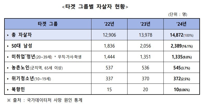 회의에서 공유된 '주요 타깃그룹 자살예방 추진방안'에 따르면 지난 2024년 자살사망자 1만4872명 가운데 50대 남성은 2389명(16.1%), 미취업 청년은 1335명(9.0%)으로 나타났다. 농촌 노인과 위기청년은 각각 545명(3.7%), 372명(2.5%)으로 집계됐다. 북향민은 10명이었다.