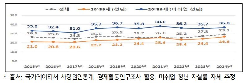 2024년 기준 20~30대 미취업 청년의 자살률은 인구 10만명당 36.8명으로, 전체 국민 평균(10만명당 29.1명)보다 높았다. 취업이나 진학 준비를 하지 않는 일명 '쉬었음 청년'(준비 중 청년)의 규모가 2023년 64만4000명에서 2025년 71만7000명으로 증가한 가운데, 미취업 청년의 자살 예방 대책이 시급하다는 진단이다. 이들 청년의 자살 사유는 정신적 문제(40.9%), 경제적 문제(29.3%) 등이었다.