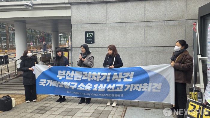 법무부가 이른바 '부산 돌려차기 사건' 피해자에게 국가 배상 책임을 인정한 1심 판결에 대해 항소하지 않기로 했다.사진은 서울중앙지법 동관 앞에서 2월 13일 변호인단이 부산돌려차기 기자회견을 하고있는 모습. [사진=뉴스핌DB]