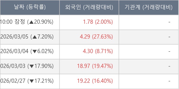 [서울=뉴스핌] 로보뉴스 = 06일 10시 15분 현재 한주에이알티(058450)는 전일 대비 20.90% (현재가 486원) 상승했고, 외국인이 최근 5일 연속 순매수(누적 48.56만 주, 잠정) 행진을 하고 있다.