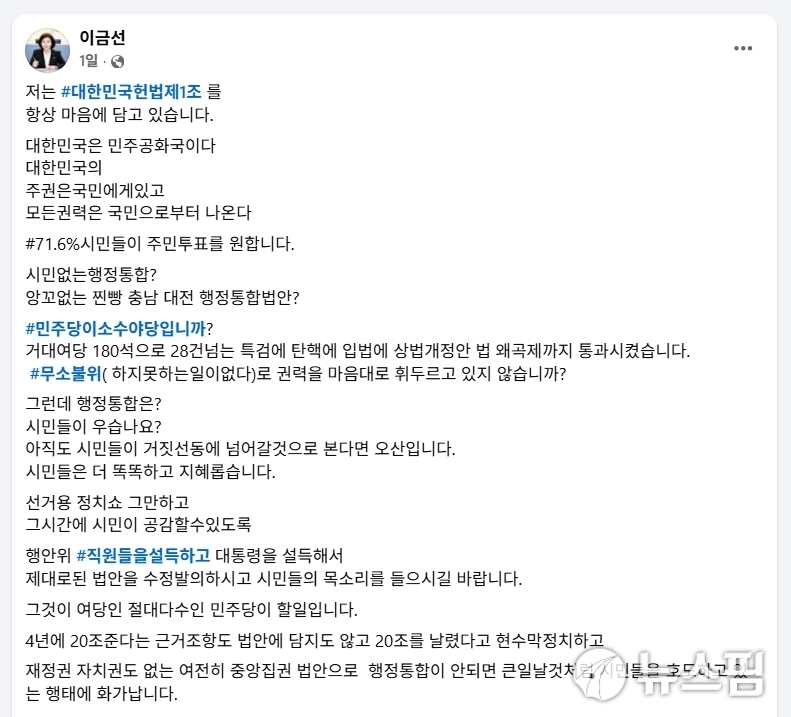 이금선 대전시의원은 "행정통합이 안 되면 큰일이 날 것처럼 시민들을 호도하고 있는 (여당의) 행태에 화가 난다"며 "행정통합 논의를 시민 중심으로 다시 시작해야 한다"고 거듭 촉구했다.