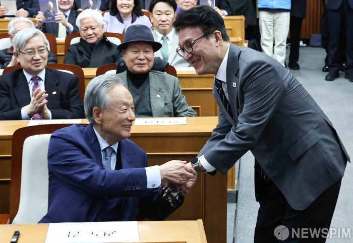 [서울=뉴스핌] 윤창빈 기자 = 권노갑 김대중재단 이사장, 김민석 국무총리가 6일 오후 서울 여의도 국회 박물관에서 열린 '권노갑 백인평전' 출판기념회에서 인사를 하고 있다. 2026.03.06 pangbin@newspim.com
