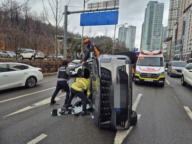 사고는 6일 오전 9시 15분경 일어났고, 소방당국에 "차 대 차 사고로 차량이 전복되어 운전자가 갇혀 있다"는 긴급 신고가 접수됐다.