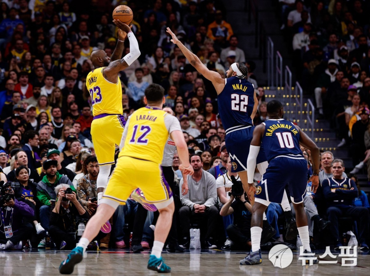 이날 제임스는 16점 8어시스트로 팀 공격을 이끌었다. 돈치치는 27점 11리바운드로 분전했지만 레이커스는 덴버에 113-120으로 졌다. 니콜라 요키치는 28점 12리바운드 13어시스트로 시즌 23번째 트리플더블을 기록하며 승리를 이끌었다. 자말 머리도 28점 7어시스트로 지원 사격을 했다. 제임스는 4쿼터 중간 왼쪽 팔꿈치를 다쳐 잠시 벤치로 물러났다가 코트로 돌아왔지만 경기를 뒤집기엔 시간이 모자랐다.