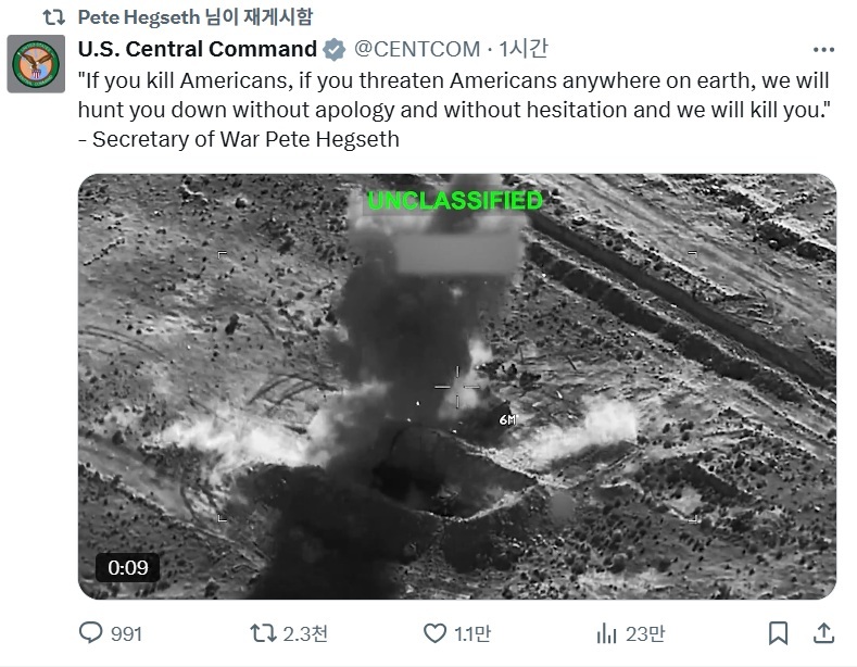 게시물에는 헤그세 장관의 발언과 함께, 미군이 차량과 건물을 폭격해 파괴하는 일련의 '비밀 해제(Unclassified)' 이미지가 담긴 21초 분량의 영상이 첨부됐다.
