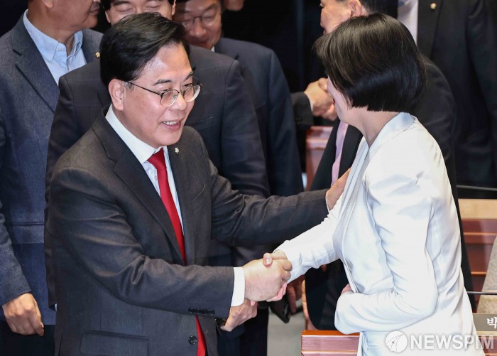 [서울=뉴스핌] 윤창빈 기자 = 송언석 국민의힘 원내대표가 9일 오후 서울 여의도 국회에서 열린 긴급 의원총회에서 배현진 의원과 인사하고 있다. 2026.03.09 pangbin@newspim.com
