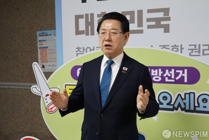 [광주=뉴스핌] 박진형 기자 = 김영록 전남도지사가 9일 오후 광주 서구 광주시선거관리위원회에서 제9회 전국동시지방선거 전남광주통합특별시장 예비후보 등록을 신청한 뒤 취재진과 만나 포부를 밝히고 있다. 2026.03.09 bless4ya@newspim.com