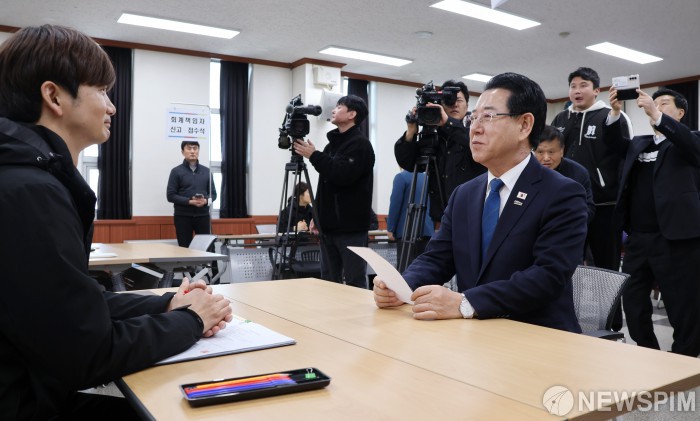 [광주=뉴스핌] 박진형 기자 = 김영록 전남도지사가 9일 오후 광주 서구 광주시선거관리위원회에서 제9회 전국동시지방선거 전남광주통합특별시장 예비후보 등록을 신청하고 있다. 2026.03.09 bless4ya@newspim.com