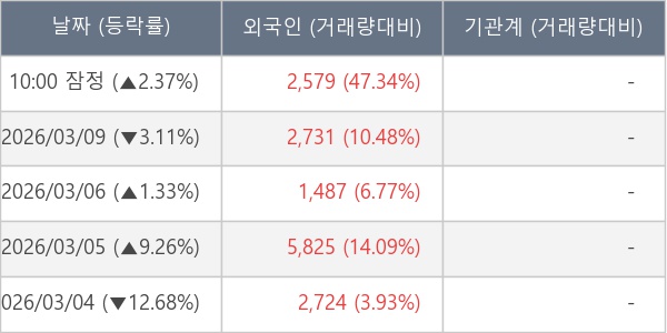 [서울=뉴스핌] 로보뉴스 = 10일 10시 15분 현재 유진테크놀로지(240600)는 전일 대비 2.37% (현재가 3,025원) 상승했고, 외국인이 최근 5일 연속 순매수(누적 15,346주, 잠정) 행진을 하고 있다.