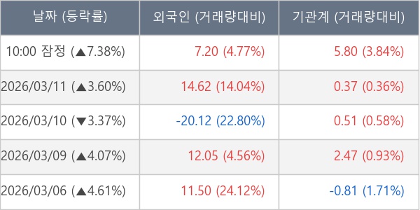 [서울=뉴스핌] 로보뉴스 = 12일 10시 15분 현재 휴스틸(005010)은 외국인과 기관이 각각 7.20 만 주, 5.80 만 주 순매수(잠정) 하면서 전일 대비 7.38% (현재가 4,950원) 상승하고 있다.