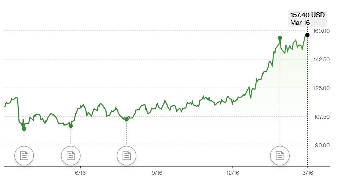 업체의 주가는 3월16일(현지시각) 157.23달러에 거래를 종료해 연초 이후 28% 뛰었고, 5년간 장기 상승률은 178%에 달했다.