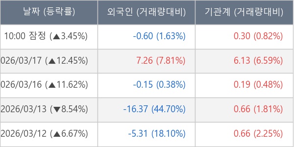 [서울=뉴스핌] 로보뉴스 = 18일 10시 15분 현재 엘티씨(170920)는 전일 대비 3.45% (현재가 28,500원) 상승했고, 기관이 최근 6일 연속 순매수(누적 79,418주, 잠정) 행진을 하고 있다.