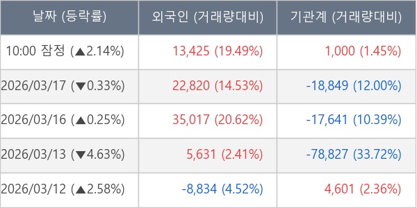 [서울=뉴스핌] 로보뉴스 = 18일 10시 15분 현재 유진테크(084370)는 외국인과 기관이 각각 1.34 만 주, 0.10 만 주 순매수(잠정) 하면서 전일 대비 2.14% (현재가 124,000원) 상승하고 있다.