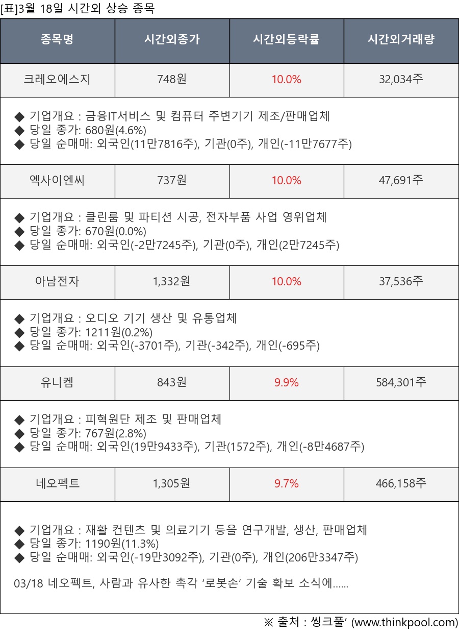 [서울=뉴스핌] 로보뉴스 = 3월 18일, 인공지능 투자비서 ‘AI라씨로’는 시간외 단일가 매매에서 주가가 크게 변동한 크레오에스지(040350), 엑사이엔씨(054940) 등의 최근 동향을 분석해서 발표했다.