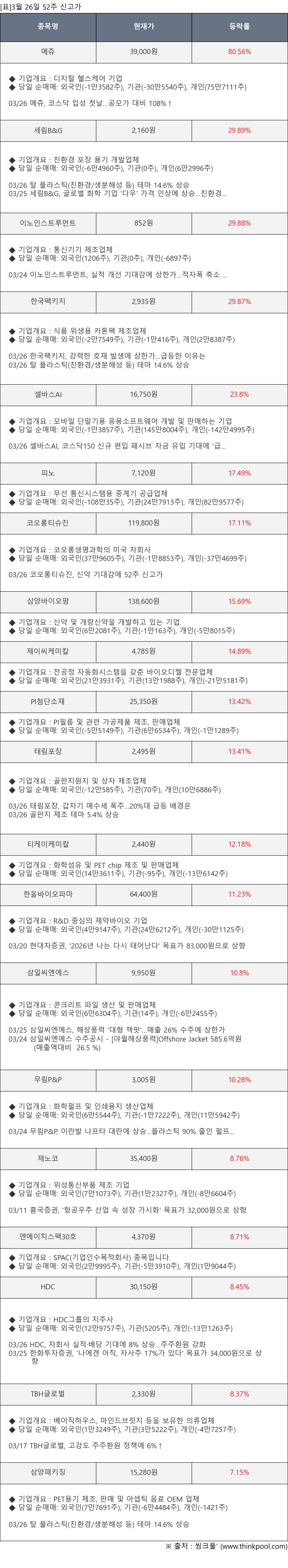 [서울=뉴스핌] 로보뉴스 = 3월 26일, 인공지능 투자비서 ‘AI라씨로’가 메쥬(0088M0), 세림B&G(340440) 등 52주 신고가가 발생한 종목들에 대한 최근 동향을 분석했다.